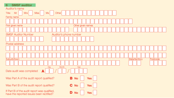 It is a requirement to have an annual SMSF audit carried out before lodging the SMSF annual return. Details of the auditor who completed the annual audit must also be included in Part A of the SMSF annual return. This includes the auditor’s personal details, their auditor number (SAN), and their contact details.